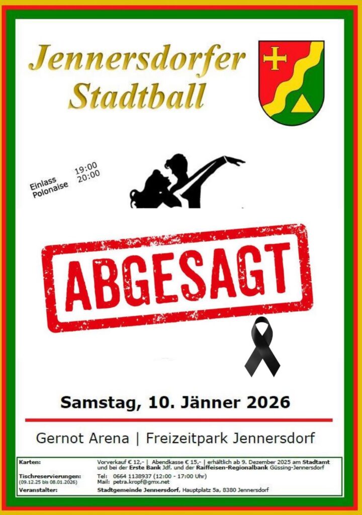 Der Stadtball in Jennersdorf muss auf Grund eines Todesfalles abgesagt werden – wir bitten um Verständis!!